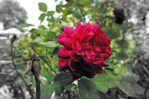A single, red rose, captures the attention, in a world that can seem harsh and bleak. Love, like this rose, stays vivid at the center of it all. Taken in Regents Park, London, in 2023..