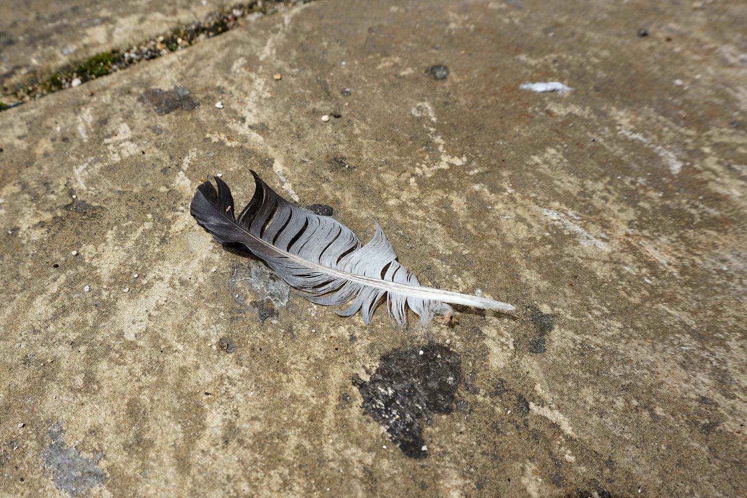 A humble feather from a city pigeon—often overlooked and misunderstood—now resting softly among the worn stones, a subtle trace of life in the urban rhythm. Taken in London, 2021.